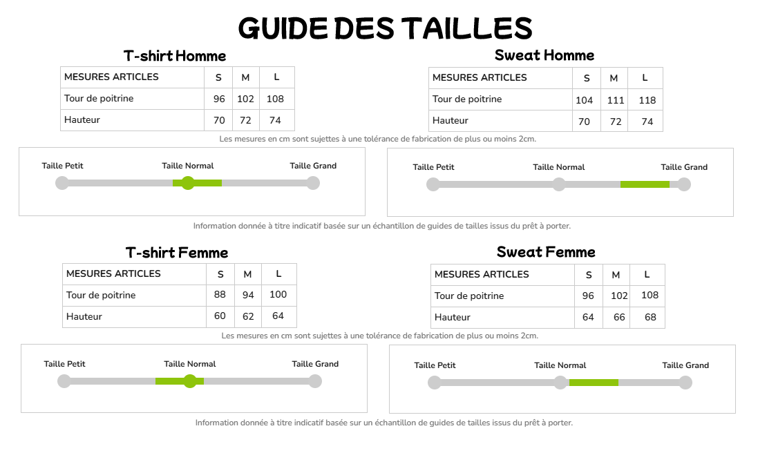 - Grammage : t-shirt 185g/m², sweat 280g/m²