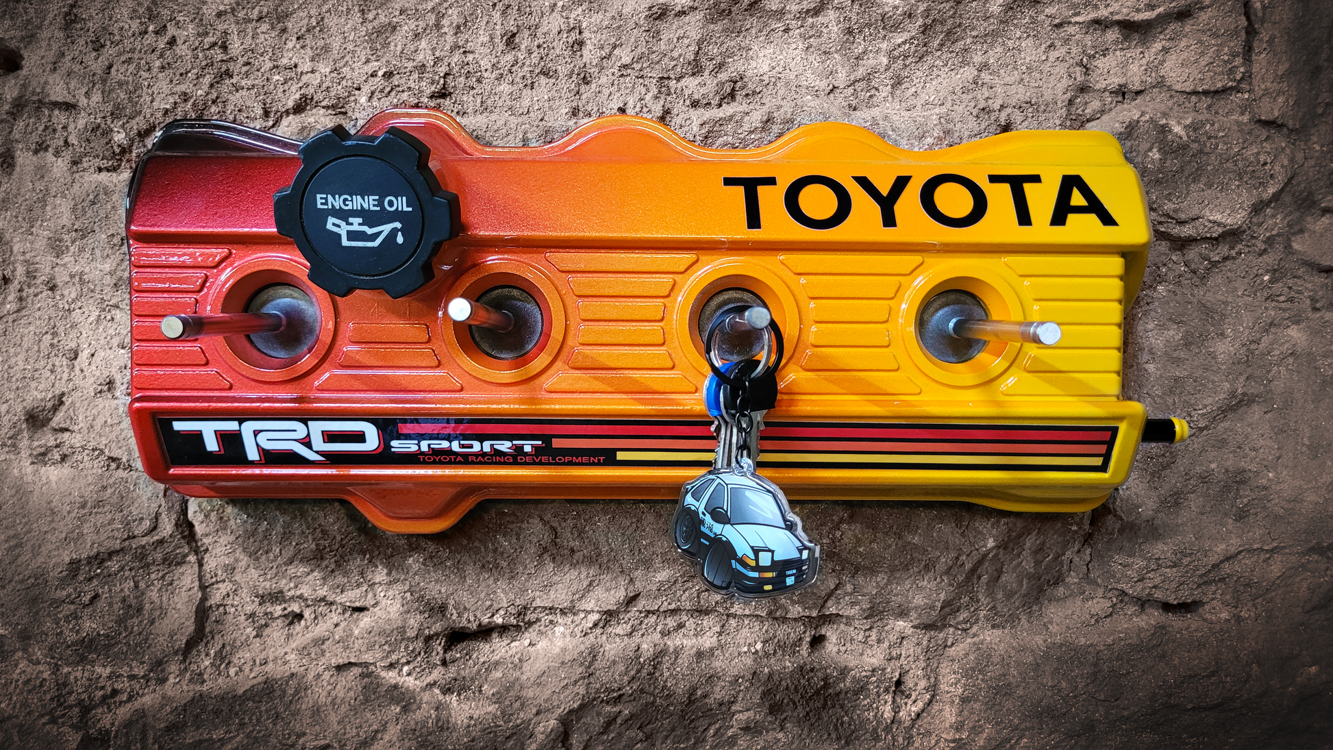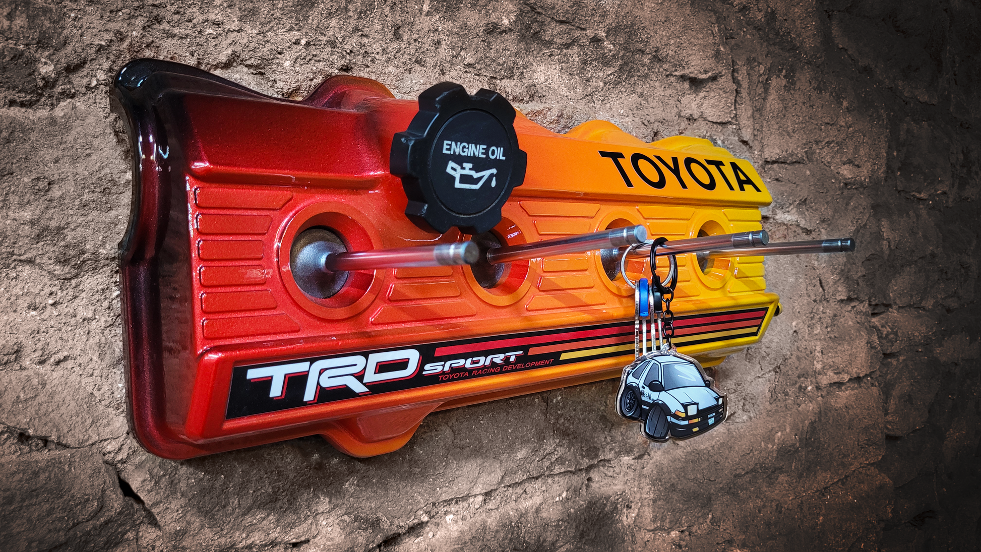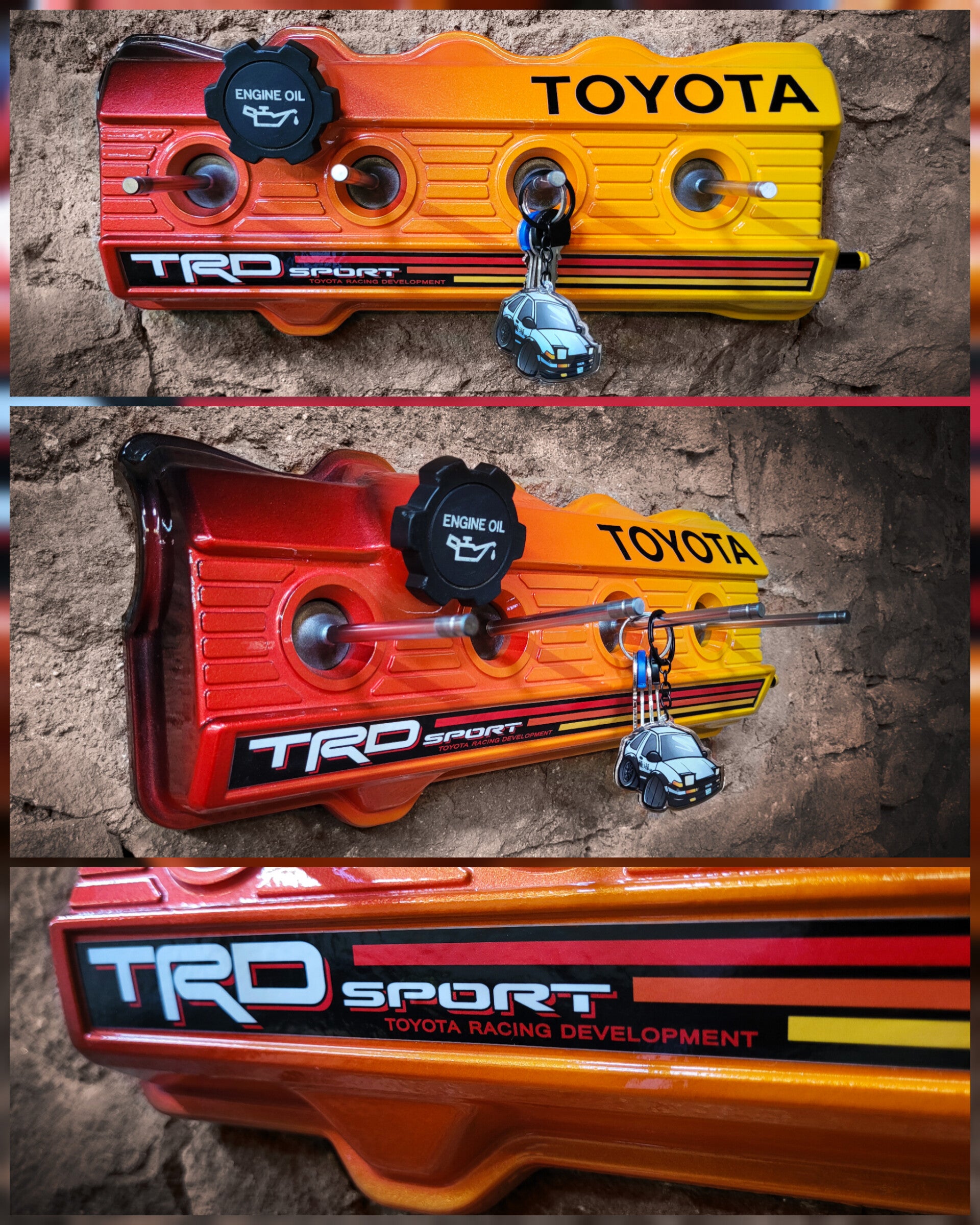 Inspiré des couleurs du préparateur automobile TRD, ce porte-clés cache-culbuteur Toyota arbore un joli dégradé de teintes nacrées et des stickers de qualité faisant honneur à la filiale iconique de Toyota.